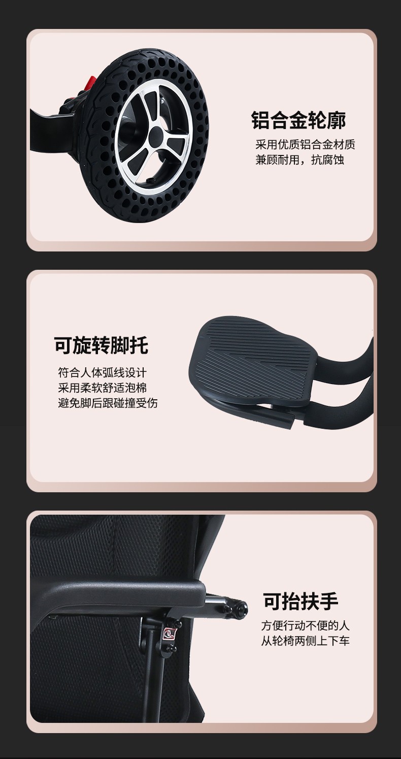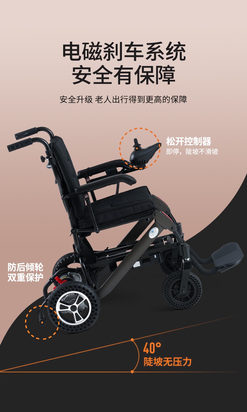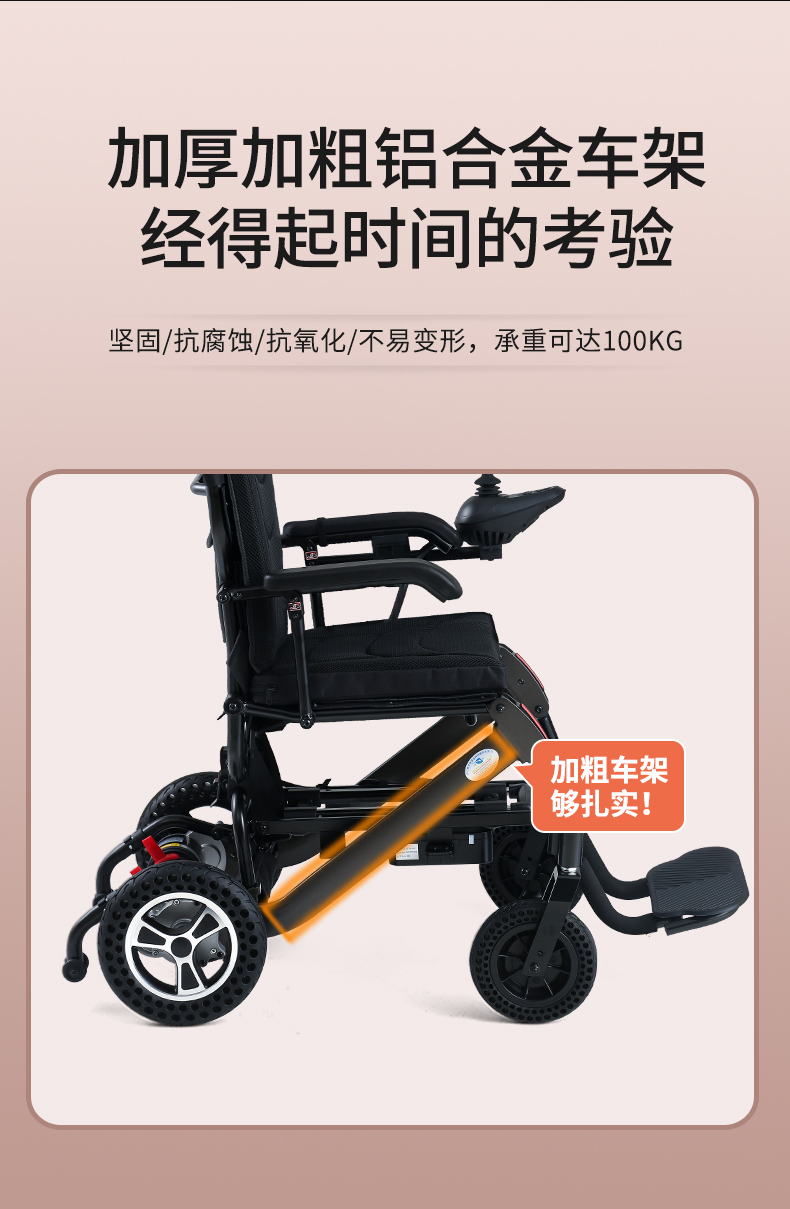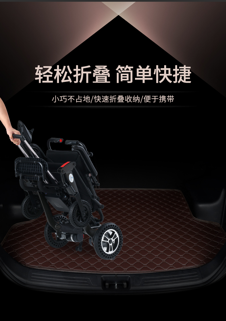 輕便折疊電動(dòng)輪椅車DY41,采用鋁合金材質(zhì)四輪蜂窩輪胎,車重僅24公斤折疊起來可以像行李箱一樣拖行,可放入后備箱
